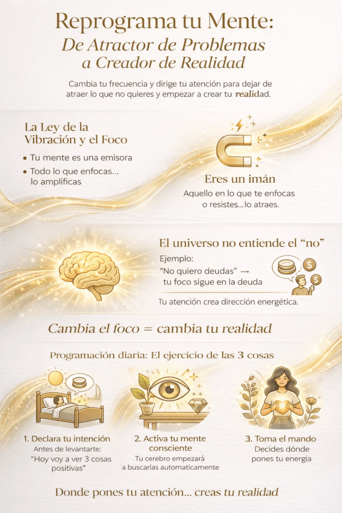 El error común del «NO»: El universo (y tu subconsciente) procesa imágenes y vibraciones, no negaciones. Si repites «no quiero tener problemas», tu atención y energía están ancladas en la palabra «problemas». Para cambiar tu realidad, debes decretar lo que SÍ deseas manifestar.